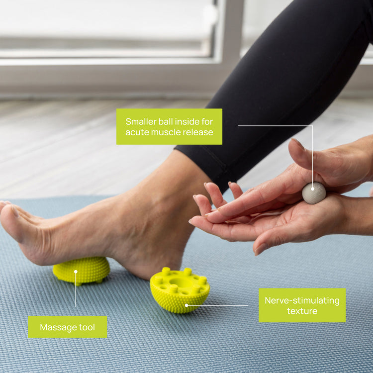 The Naboso Neuro ball is a versatile solution for foot activation and comfort, offering a triple threat approach. Initially serving as a massage tool, it releases foot muscles through rolling. Secondly, its unique sensory stimulation textures awaken the nerve-dense surface of your feet. Finally, the ball splits in two, revealing a smaller center ball for targeted muscle release.